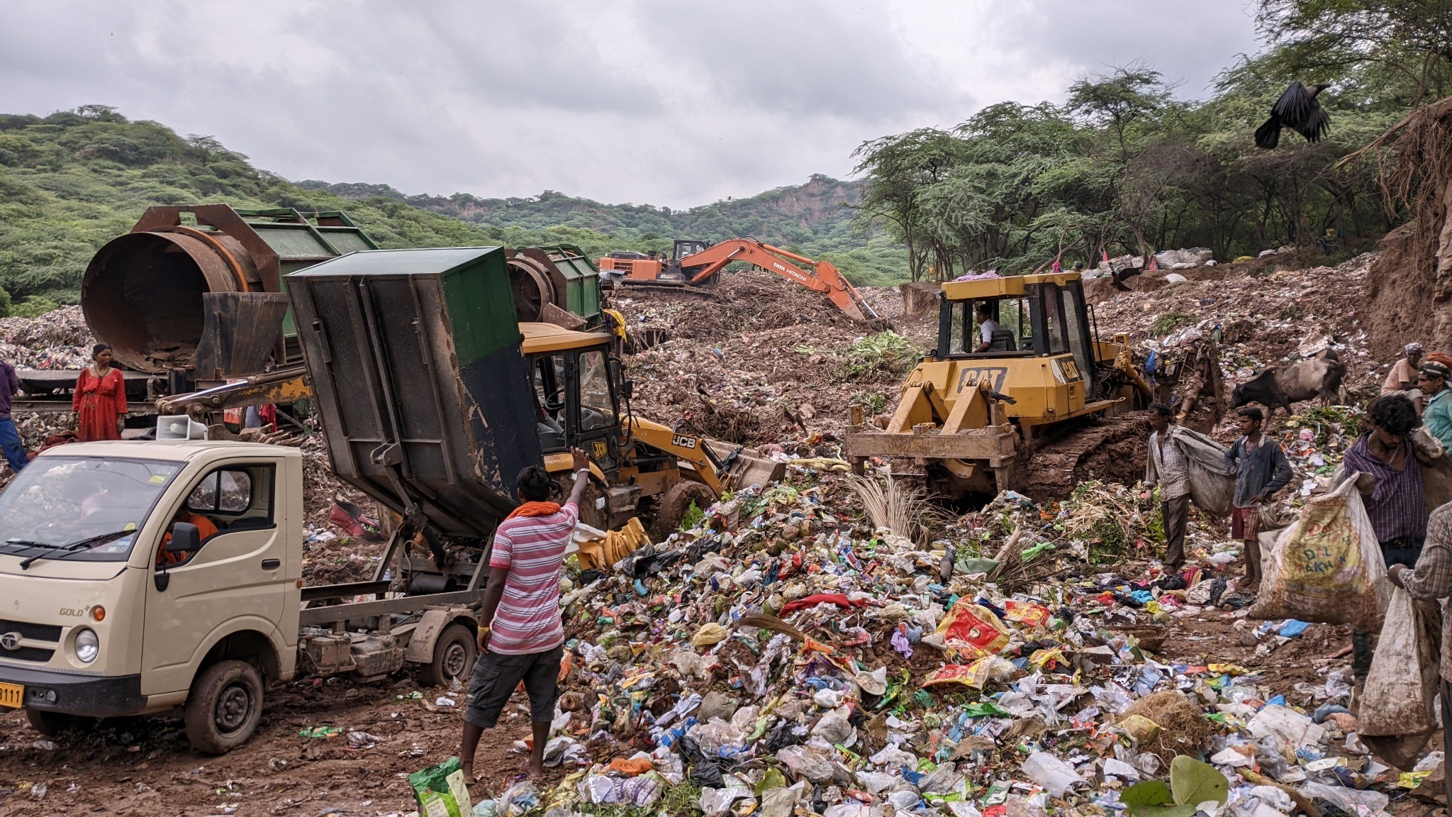and occupational health risks. Heavy machinery and workers operate in a dumpsite surrounded by plastic and other non-biodegradable waste. The unscientific handling